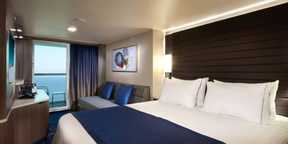 A cabine será com varanda e compartilhada entre duas pessoas do grupo. A cama de casal e pode ser conversível em duas de solteiro (mediante solicitação), sofá-cama. Tem ar condicionado, WI-FI, TV interativa, tomadas 110/220 volts, frigobar, cofre, banheiro privativo, produtos de higiene, secador de cabelo, serviço de quarto 24h (serviço tarifado).